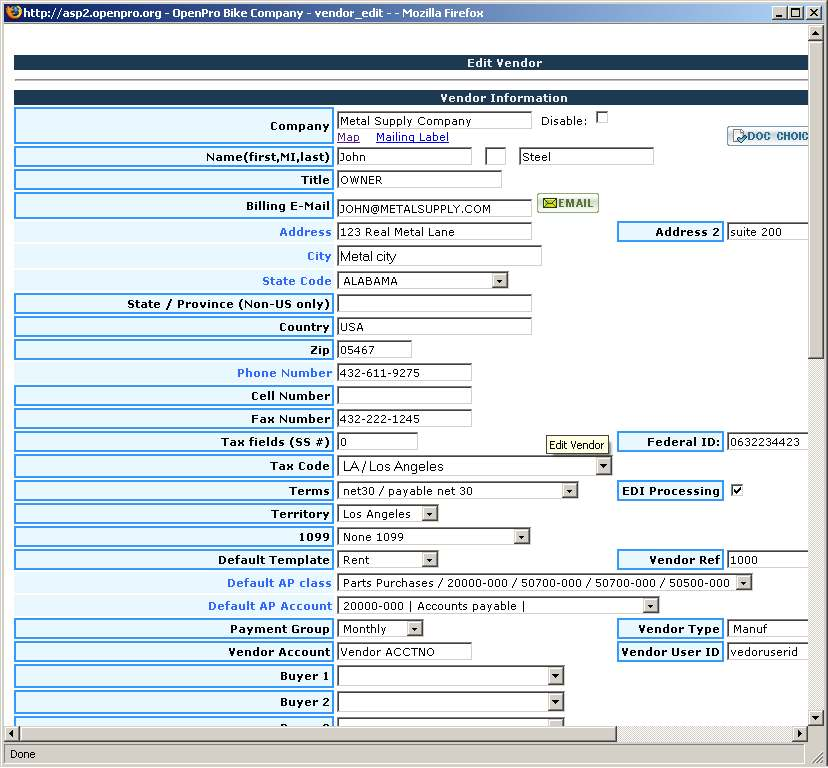 In order to edit a vendor you need to go back to the general AP Vendors list, and locate the vendor that you would like to make changes to. Once you have found the vendor click the green Edit button located to the right of the vendor. A window similar to the following will appear: