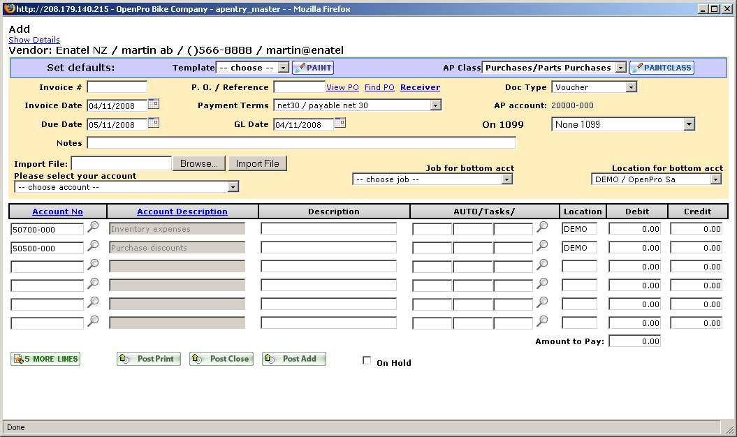Begin by opening the AP Vendors list in the Payables menu. Choose a vendor for whom you would like to start a voucher. The voucher creation screen is shown below.