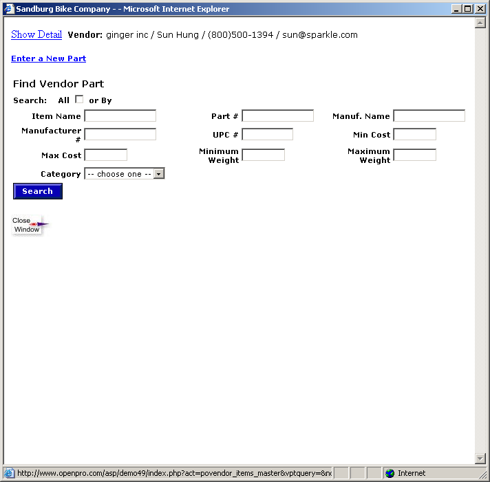 Once you have selected to enter a new part, you must search for the item by the options given. If you do not know any of the information you may search by category then it will give you a list of items in a drop down box you may select. Once you have selected the correct item, click on auto fill then add. This will link the item to the specified vendor you have chosen. Do this for every vendor you may create a purchase order for the item. The following screens will show you the steps.