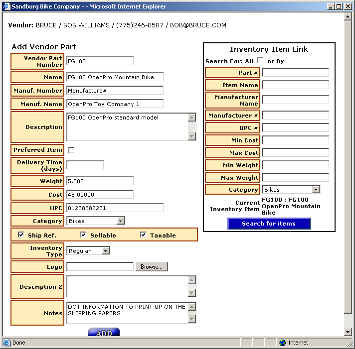 To do a purchase order through the sales order page the item selected must be linked to a vendor(s). We will use item FG100 as an example. To bring the item to the sales order you may search by putting in the part number, by categories, or the options given on the page. Once you have found the item the sales order page will update itself like the following: