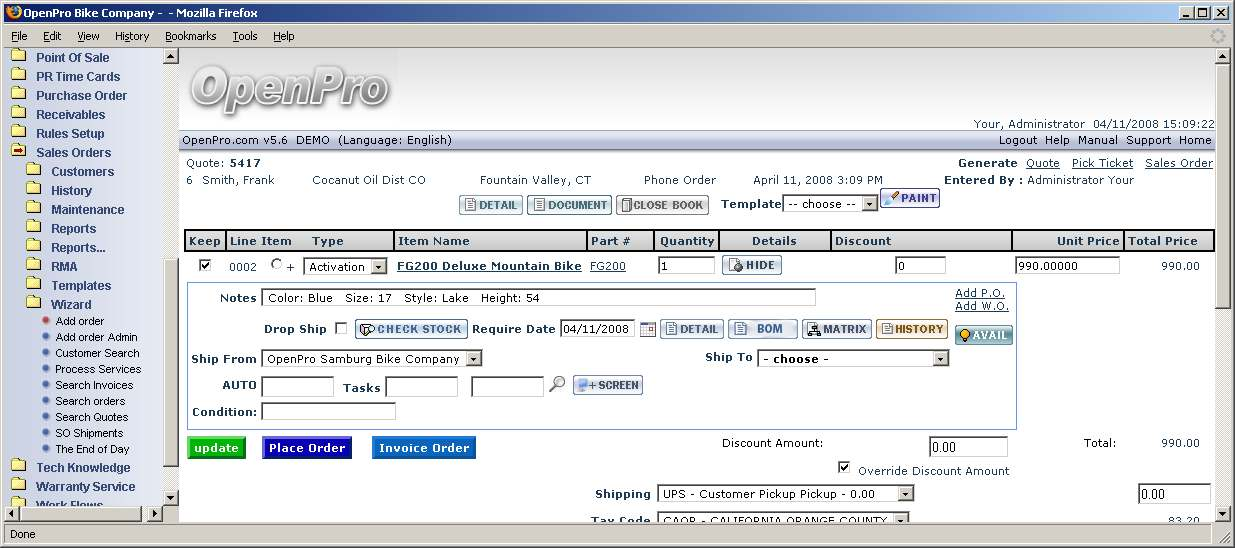 Once this step has completed, on the sales order page click on the update button then place order. This will save the sales order in the shipping queue waiting for the item to be received by the vendor to ship out to customer.