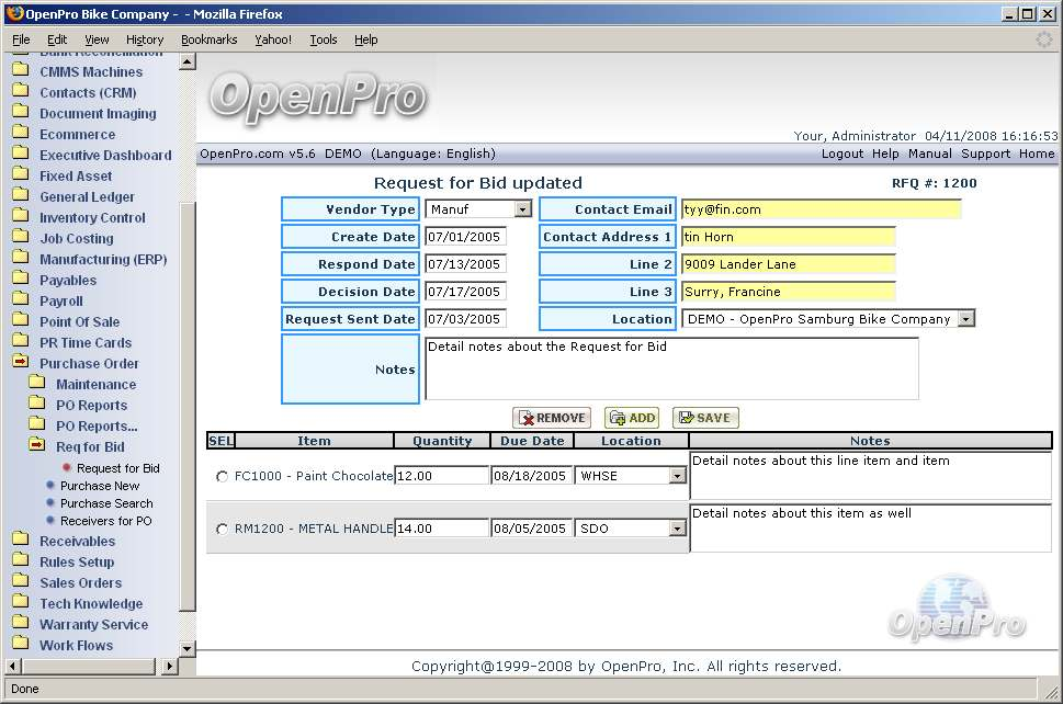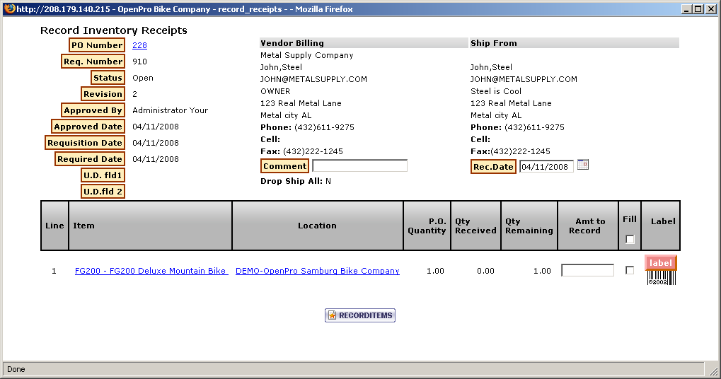 The OpenPro Software Systems' Purchase Order module is designed to manage a company's entire purchasing process. It is an accrual system with a complete vendor master file, vendor items and interface with inventory control. Purchase Order can assist in the management of inventory by scheduling receipts dates and by keeping track of vendor performance and payment terms.