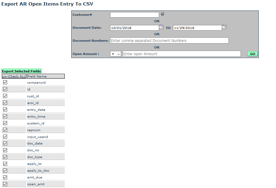 The Export aropen items entry to csv Screen allows you export the record of each cash receipt (payment you receive) or credit memo to one or more specific sales (invoices), debit memos, or finance charges in CSV format.