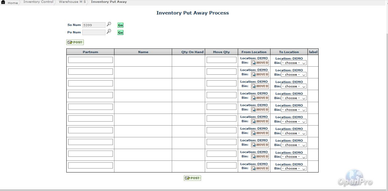 The Inventory Put Away Screen handles the process of receiving inventory into the company and moving it to the warehouse, replenishment area or the picking area. You will need to select the Sales Order or Purchase Order number for the items you want to move.